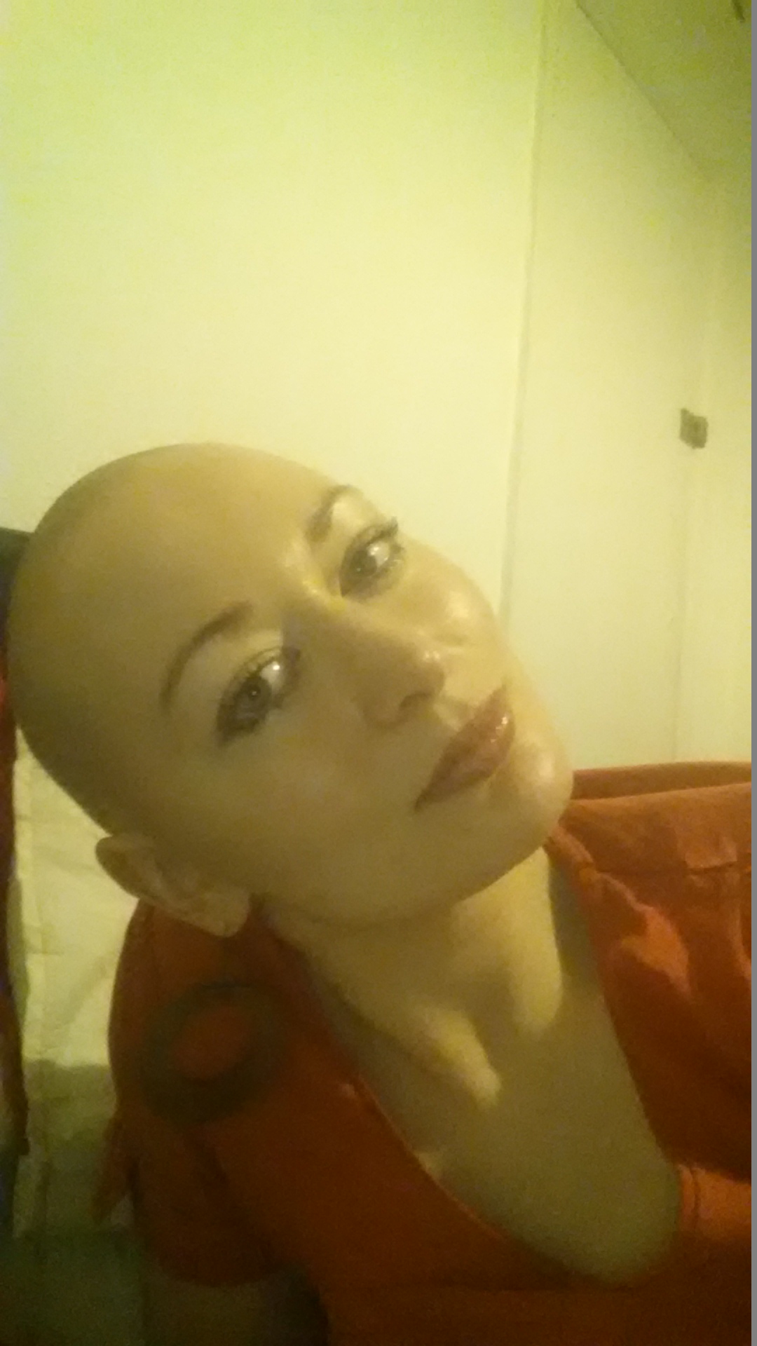 I wore the wig for only two days when I decided to shave my head. I had enough of the hair loss and needed to get some control back so my brother came over to shave it for me. I called it our “Thelma and Louise” moment, when they hold hands before leaping over a cliff. I had looked to the internet for inspiration of people embracing their bald head and I couldn’t find anything that comforted me into the leap of the unknown. I was nervous; what if I looked like an egg, what if I didn’t have a good shape head. The thought never crossed my mind that I would go out in public with my bald head. I thought I was doomed to hide underneath my wig for the next 6 months while waiting for the hair to grow back.