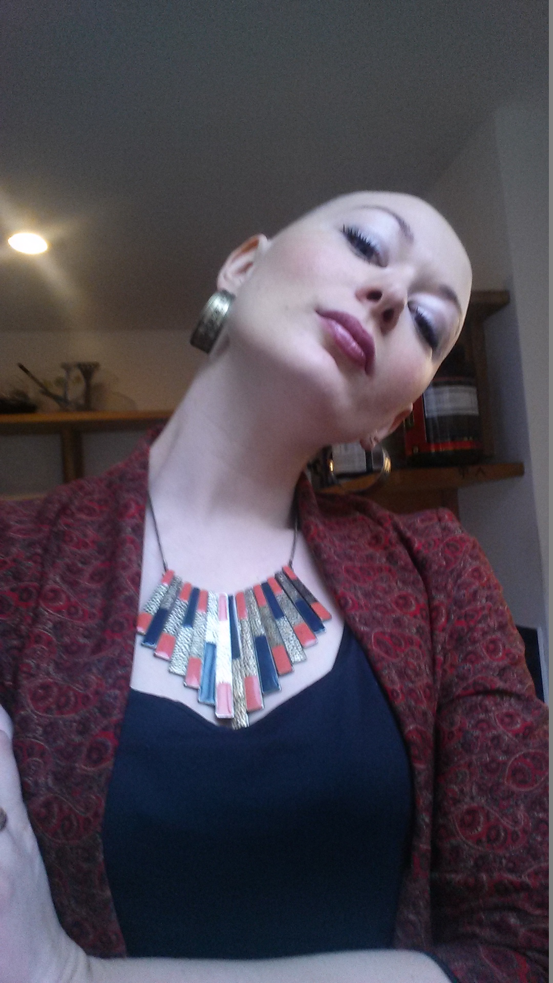 Getting ready in the mornings, I rummage through my wardrobe. It takes time to to rejig my clothes to find a style that honours my head. The upside of not having hair is that I have more time on my hands in the morning to think about what outfit I should wear. I never really gave much thought to my day to day outfits before but now I can’t just throw on what I used to wear, my clothes and accessories have to match the bald attitude!