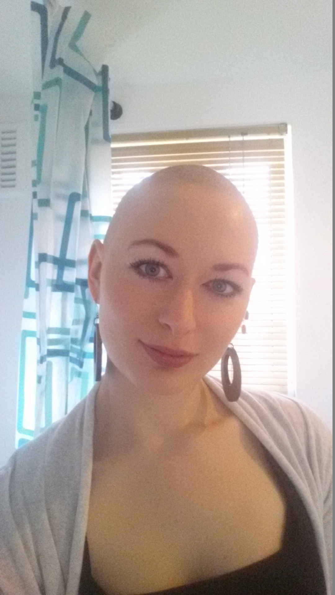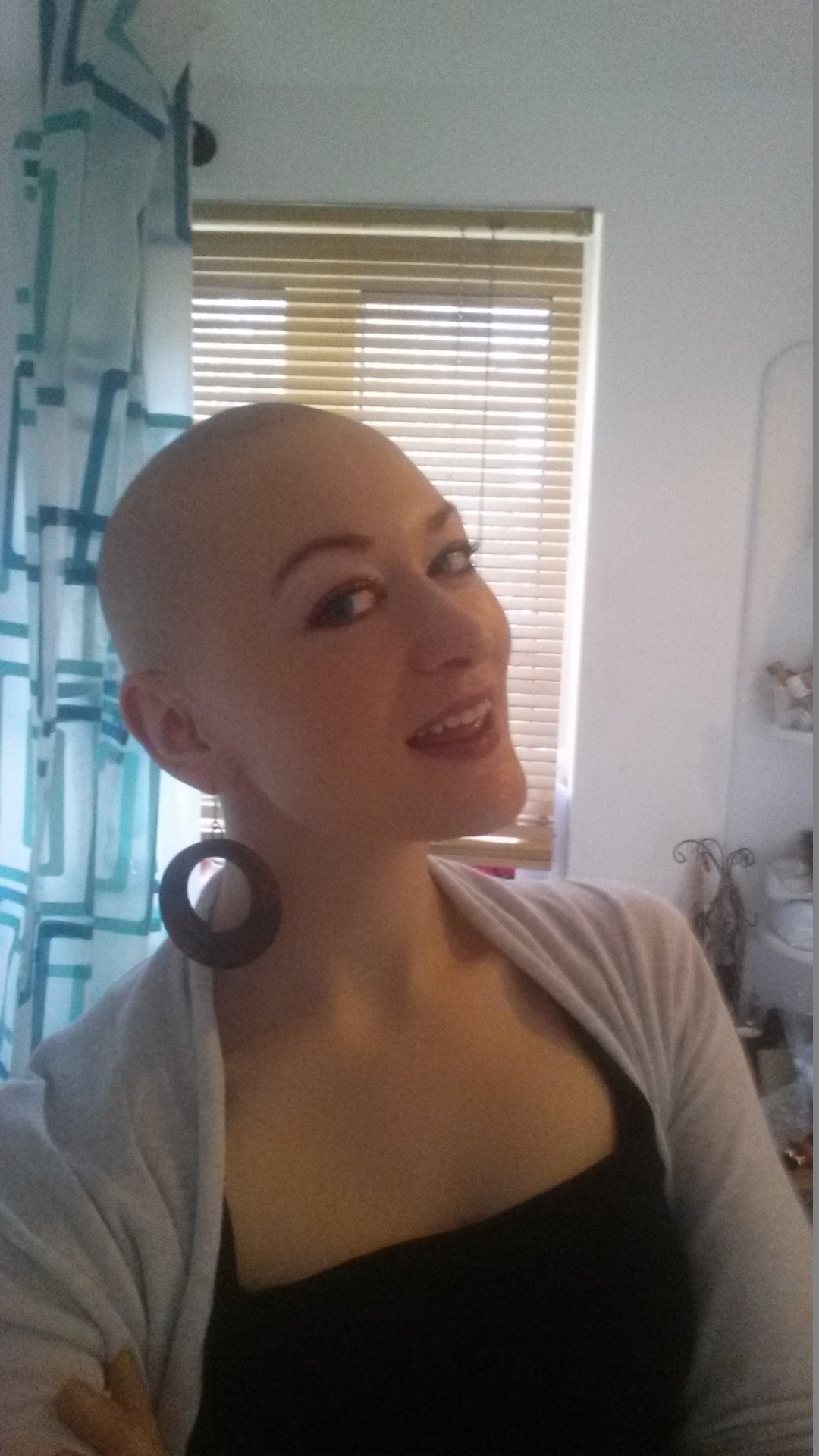 It’s the day after shaving my head and as I get ready, I feel rejuvenated and excited. I can’t wait to see the new me. Strangely I had to put on my earrings first so I had something to work off when doing my makeup; I don’t know why, perhaps to match or to be in symmetry!
