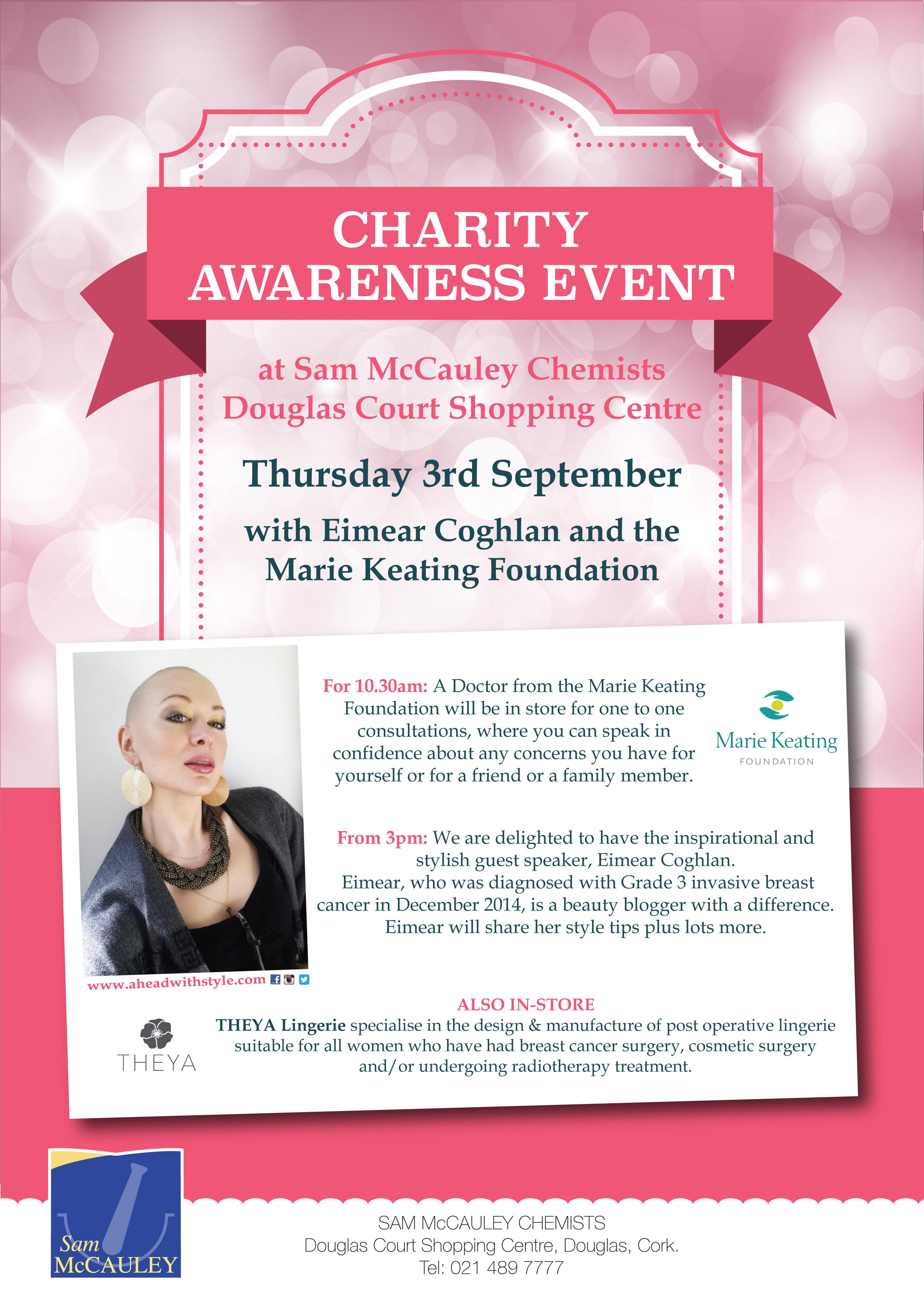 Sam McCauley Chemists, Wexford: I was Guest Speaker and gave my 20 minute “Chemospiration” speech at Cancer Charity Event, teaming up with Marie Keating Foundation and Tanorganic.